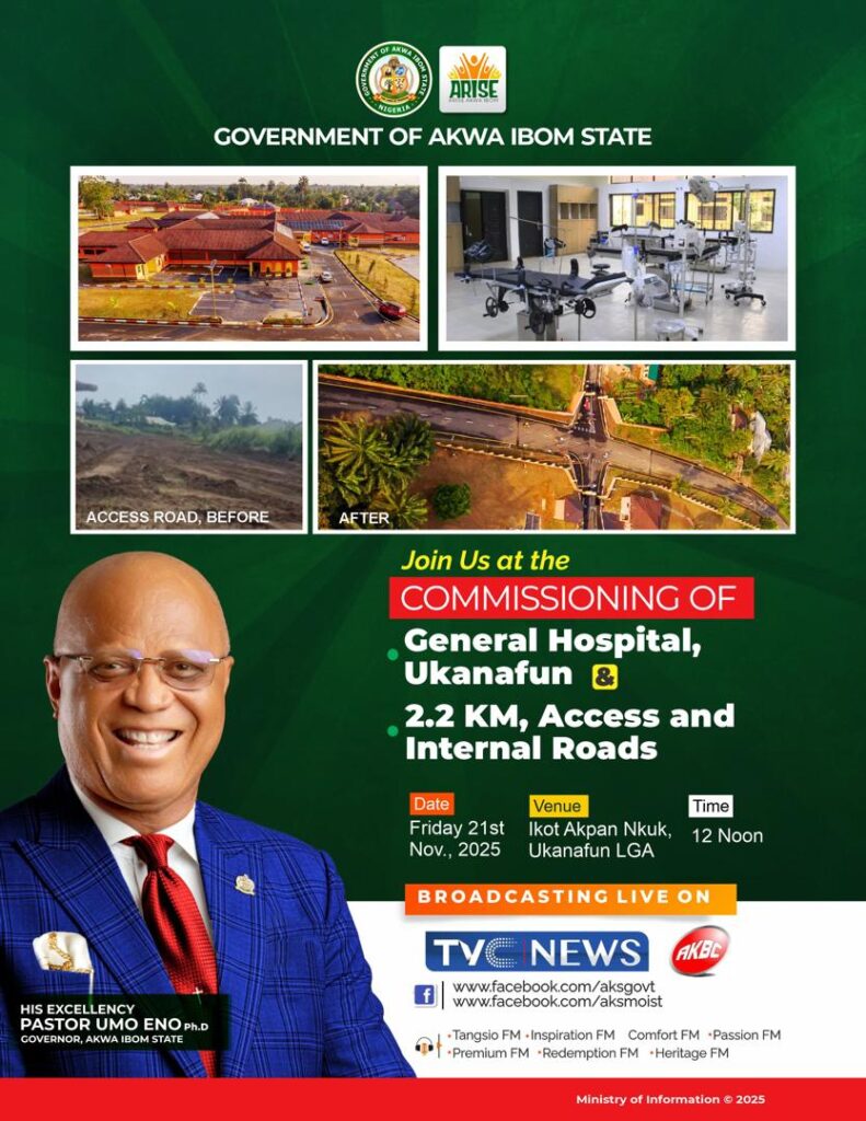 1. The Governor of Akwa Ibom State, His Excellency, Pastor Umo Eno,PhD, will on Friday, 21st November, 2025, officially inaugurate the newly constructed and fully equipped General Hospital, with 2.2 kilometres of access and internal roads in Ikot Akpa Nkuk, Ukanafun local government area. The project stands as a flagship healthcare intervention under the ARISE Agenda’s commitment to accessible, modern, and people-centered Health care delivery system across the State.