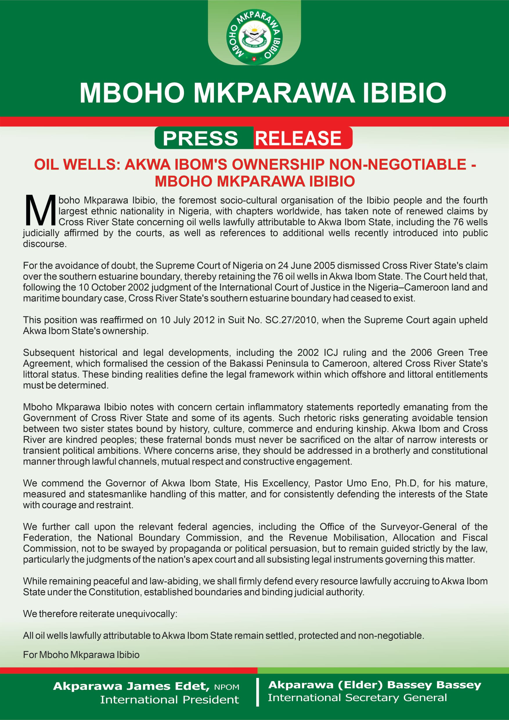 Mboho Mkparawa Ibibio, the foremost socio-cultural organisation of the Ibibio people and the fourth largest ethnic nationality in Nigeria, with chapters worldwide, has taken note of renewed claims by Cross River State concerning oil wells lawfully attributable to Akwa Ibom State — including the 76 wells judicially affirmed by the courts, as well as references to additional wells recently introduced into public discourse.