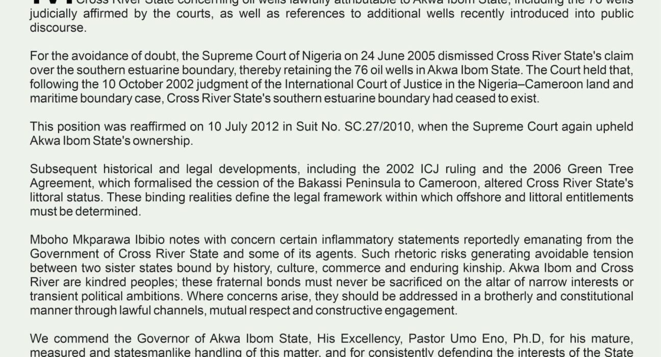 Mboho Mkparawa Ibibio, the foremost socio-cultural organisation of the Ibibio people and the fourth largest ethnic nationality in Nigeria, with chapters worldwide, has taken note of renewed claims by Cross River State concerning oil wells lawfully attributable to Akwa Ibom State — including the 76 wells judicially affirmed by the courts, as well as references to additional wells recently introduced into public discourse.