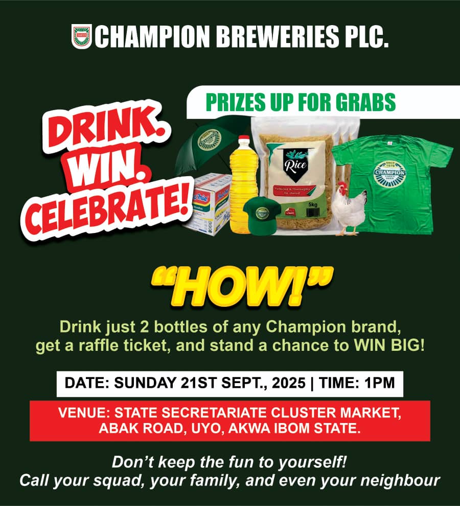 “Champion Breweries remains excited to create this memorable experience for our consumers. Champion brands have been a household name in Akwa Ibom for decades, and this event is our way of saying ‘thank you’ for the loyal support. We encourage everyone to come, enjoy their favourite Champion brands, and win amazing prizes outrightly at State Secretariat Cluster Market Uyo this coming Sunday.”
