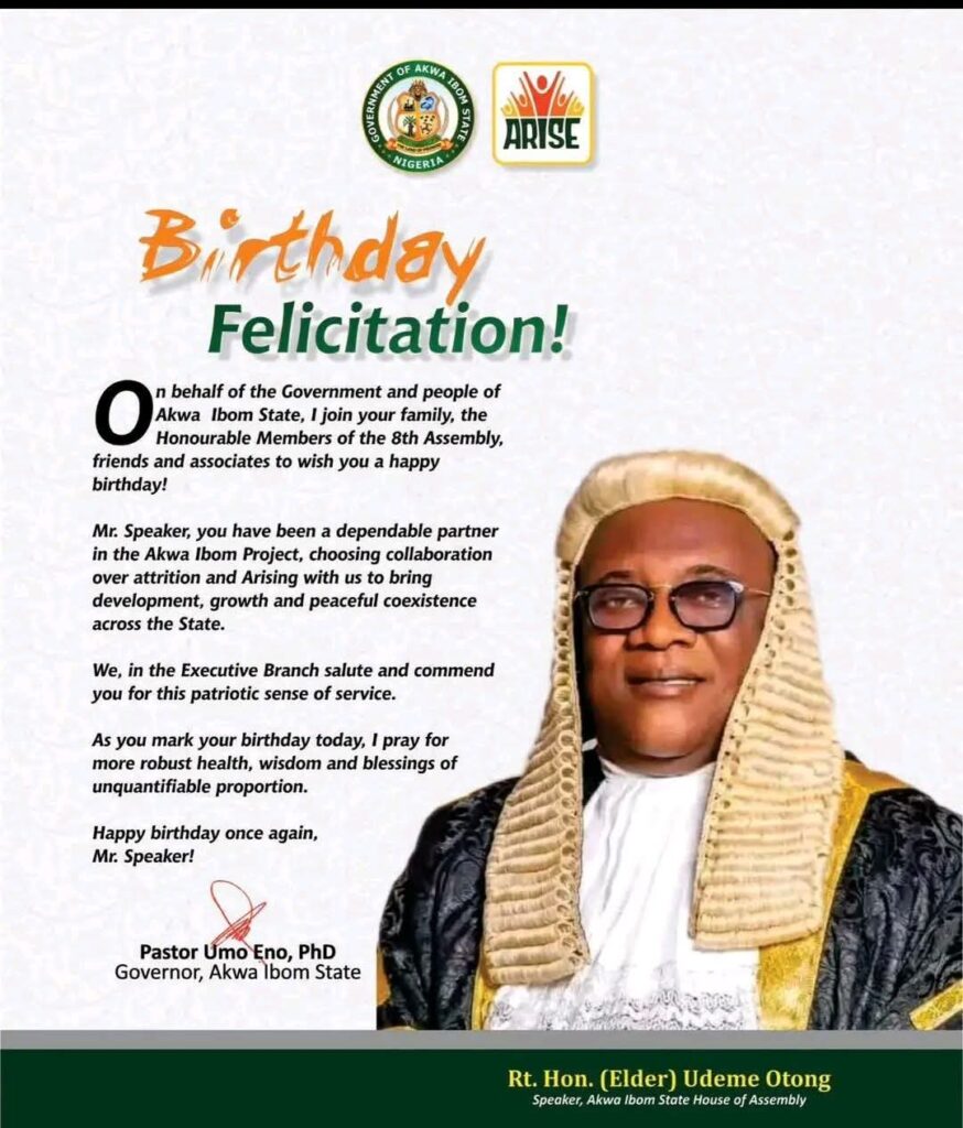 Akwa Ibom State Governor, Pastor Umo Eno, Ph.D, extends warm birthday felicitations to the Speaker of the Akwa Ibom State House of Assembly, Rt. Hon. (Elder) Udeme J. Otong